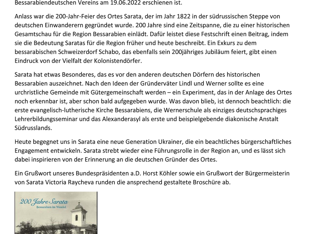 Festschrift zum Bundestreffen 2022, 200 Jahre Sarata - Bessarabien im Wandel