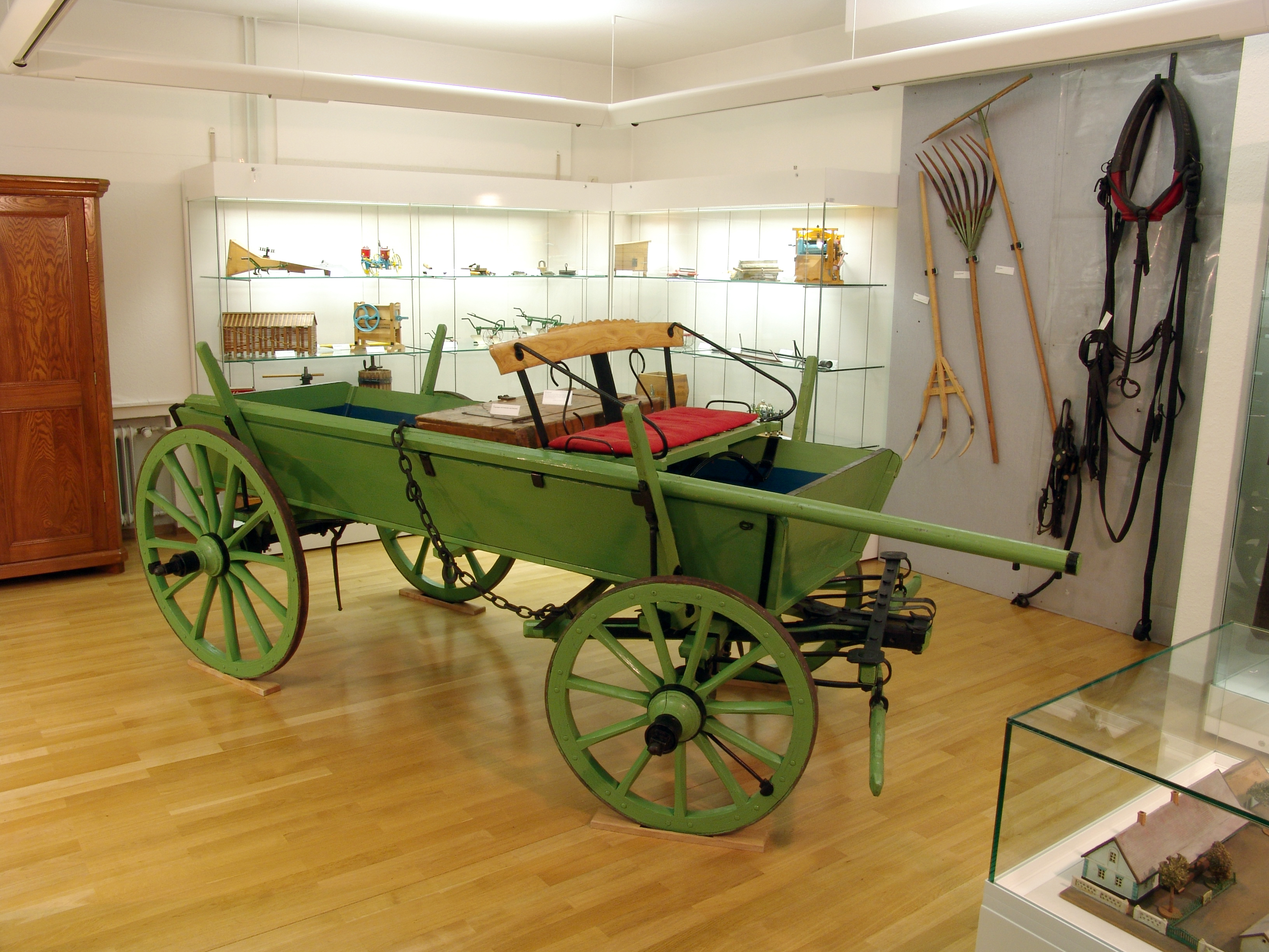 Überwiegend wurde er als Trogwagen benützt (wie im Museum zu sehen). Die Räder waren aus einem Stück Akazienholz gebogen. Dadurch konnte das Rad kurze Strecken auch ohne Reifen fahren. Die Eisenreifen wurden glühend aufgezogen und gaben dem Rad beim Erkalten eine große Vorspannung und damit eine große Belastbarkeit. Die Nahtstelle hatte zur Verstärkung noch eine Eisenspeiche.