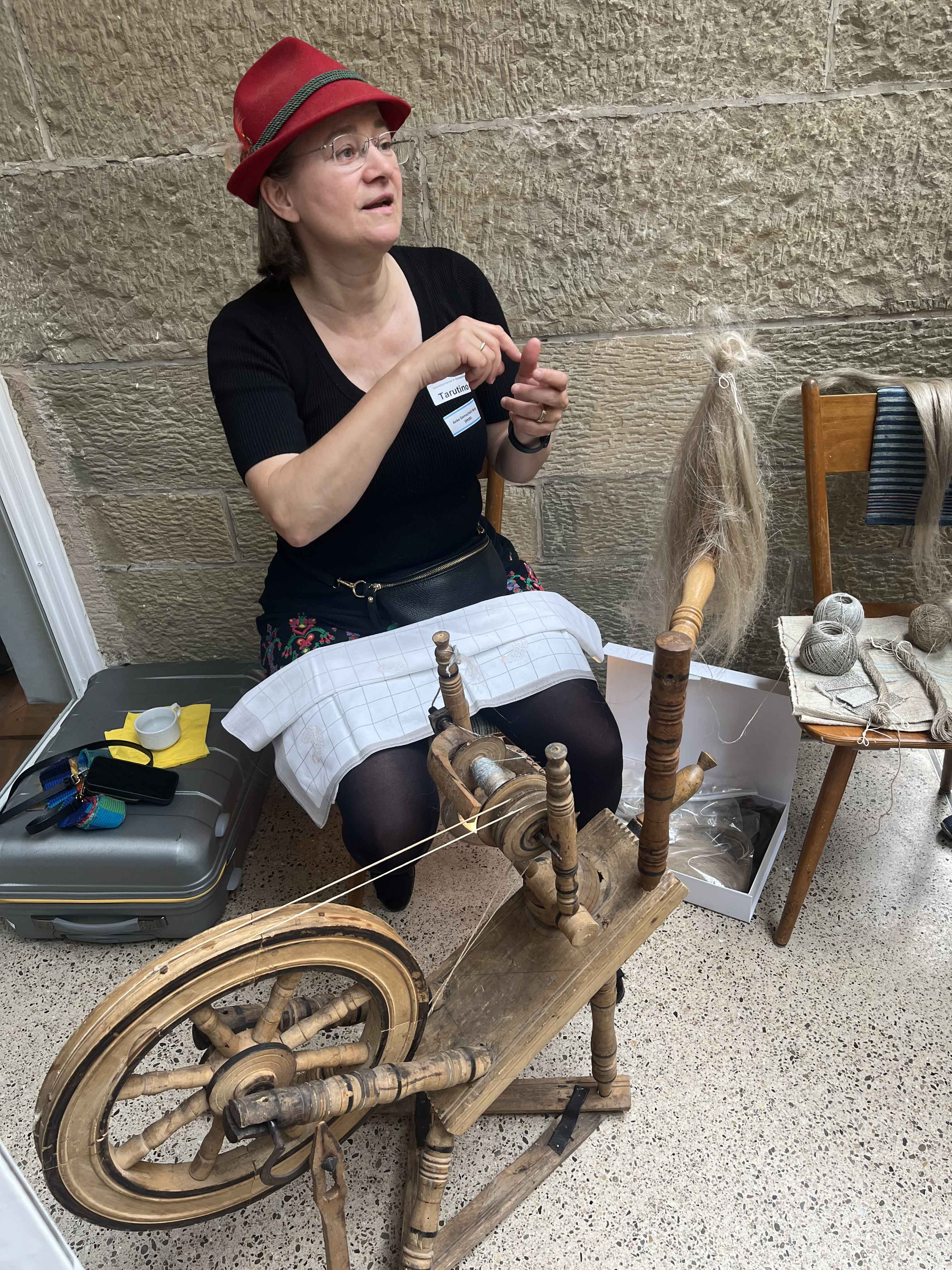 Ich bin leidenschaftliche Spinnerin und spinne sowohl mit Handspindeln als auch mit Spinnrädern und zwar ziemlich viel. (Ich habe auch einen Instagram-Kanal, wo ich einiges an Spinnereien zeige, @adomscheitberg). Das ist mein Ausgleich zur Politik. Als ich las, dass Paten für Ausstellungsobjekte gesucht werden, dachte ich sofort, dass das Spinnrad perfekt für mich wäre. Eine schöne Geschichte war, als ich zum Bundestreffen 2024 die Spinnräder im Museum ausprobiert habe, um dann während des Treffens eines vorzuführen. Bei den Probem am Abend zuvor ist auvh ein lustiges Video entstanden.
