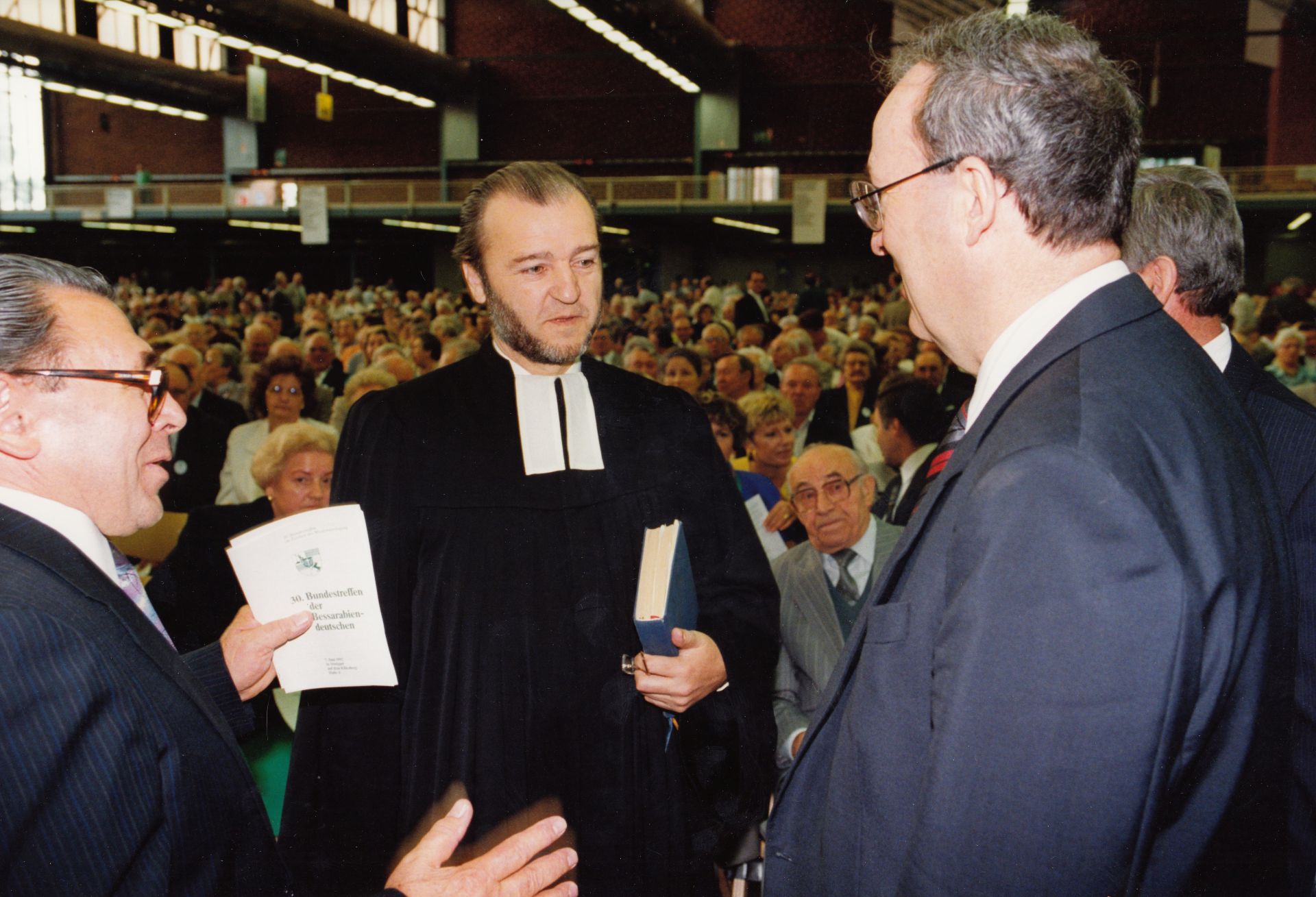 Die jungen bessarabiendeutschen Theologen studierten nun meist in Tübingen, Leipzig, Marburg oder Wien. Als geistliches Oberhaupt im Rang eines Bischofs wirkte von 1920 bis 1937 Oberpastor Daniel Haase (1877-1939), der auch politische Funktionen übernahm. 1939 löste ihn Immanuel Baumann (1900-1974) ab, der sein Amt auch während der Lager- und Ansiedlungszeit, sowie erneut nach dem Zweiten Weltkrieg u.a. als ‚Landesflüchtlingspfarrer‘ ausübte. Wenn auch nach seinem Ausscheiden das Oberpastorenamt nicht mehr vergeben wurde, übernahm sein Sohn Arnulf Baumann (1932-2022), dessen Talar hier ausgestellt ist, vergleichbare Funktionen in Hilfswerk, Landsmannschaft, Verein und Historischer Kommission.“ (Ende des Tafeltextes).