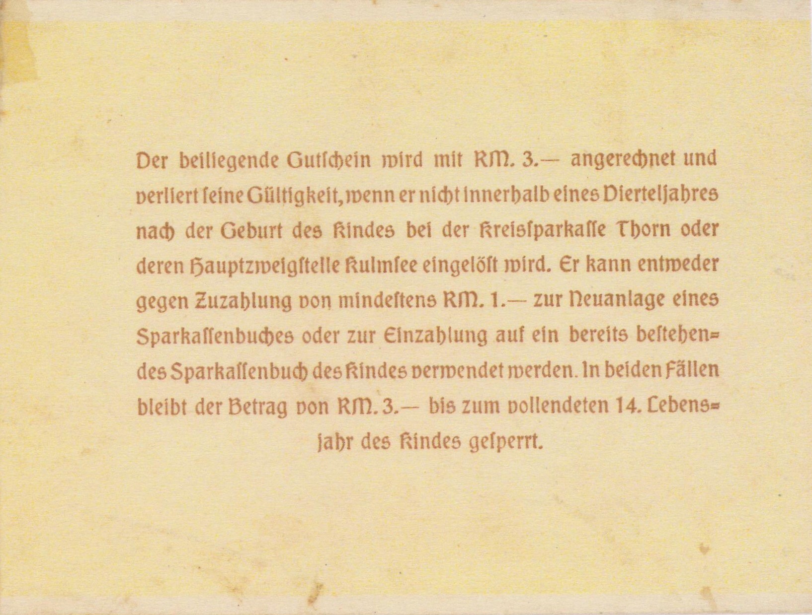 Ich hatte nun einen Gutschein gefunden, der für ein kleines Mädchen mit Namen Hildegard im Jahr 1943 von der Kreissparkasse Thorn ausgestellt und den Eltern übergeben wurde. Und auch er war als Anreiz für „Ein Sparkonto von der Wiege an“ vorgesehen. Eingelöst wurde er wohl nicht, es gibt keinen Vermerk dazu. Aber er wurde wohl als Erinnerung aufbewahrt und irgendwann, zusammen mit zwei Taufbriefen, unserem Museum übergeben.